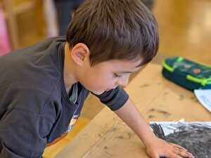 Zeitgleich konnte die Schule Patrick Müller vom INSPIRATION-Verein für sich gewinnen. Er lud die Kinder dazu ein, aus dem Herzen heraus zu malen. Den Kopf auszuschalten, der etwas Konkretes abzeichnen und so malen möchte, dass es dann den Eltern oder den Lehrpersonen gefällt. Losgelöst von angeblicher Schönheit, plädierte er zum intuitiven Malen, stellte die Gefühle und Emotionen in den Mittelpunkt, liess diese durch die Hand und die Farben auf das Blatt kommen, gab dem Herzen Raum. Die Kinder hatten grosse Freude an den mitgebrachten Schatzkisten und konnten es kaum erwarten, bis diese endlich geöffnet wurden. Der Schatz darin war das vielseitige Werkzeug für die Umsetzung: Neocolor, Kohlenstifte, Filz- und Farbstifte, Kreide zum Verwischen, dicke Edding-Stifte und viele mehr. Grosse, weisse Papiere luden ein, Farbe aufzutragen und kreativ zu sein. So entstanden viele ausdrucksstarke Kunstwerke, welche gezielt weder verglichen, noch bewertet wurden. Es bereitete den SchülerInnen grosse Freude, einmal ohne Auftrag und ohne Erwartungen zu malen. Weitere Infos zum Verein finden Sie unter https://www.inspiritation-verein.ch